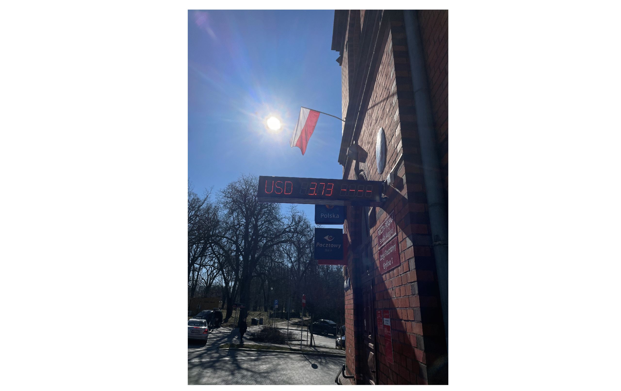 Szyld jest zamocowany przed głównym wejściem na pocztę w Gryfinie. Wyświetla na zmianę kurse EUR i USD. Ta placówka nie prowadzi sprzedaży dolara co zostało zaznaczone pionowymi liniami.