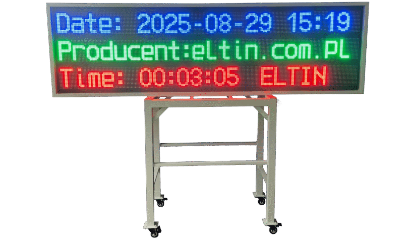 Wyświetlacz wyświetla na górze aktualną datę i czas, na środku dowolny tekst a na dolnym jest widoczny stoper z komentarzem do niego (czyli również dowolnym tekstem). Komunikacja wyświetlanych treści odbywa się za pomocą protokołu ModBusTCP a stoper jest uruchamiany za pomocą protokołu zażyczonego sobie przez klienta.